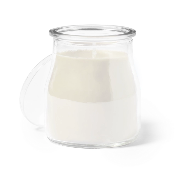 Bougie parfumée en pot de verre, disponible en senteurs assorties : blanc vanille baies rouges bleu océan et vert mousse. Avec label Made In Europe.