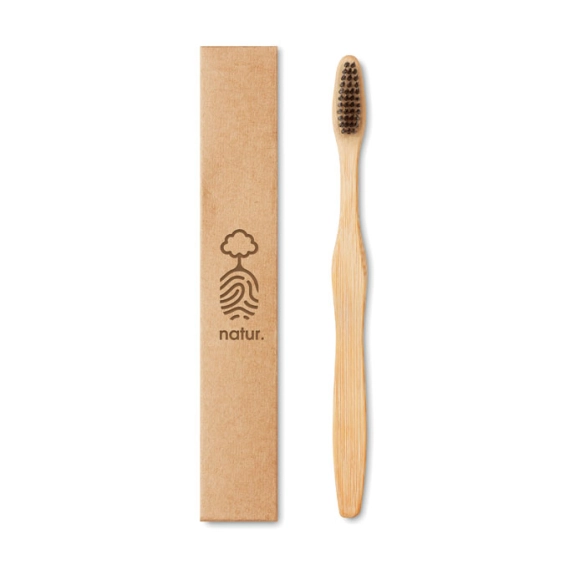 Brosse à dents avec manche en bambou et brosse en nylon. Présenté dans une boîte en papier kraft. Le bambou est un produit naturel, et présente de légères variations de couleur, de décoration et de tailles.