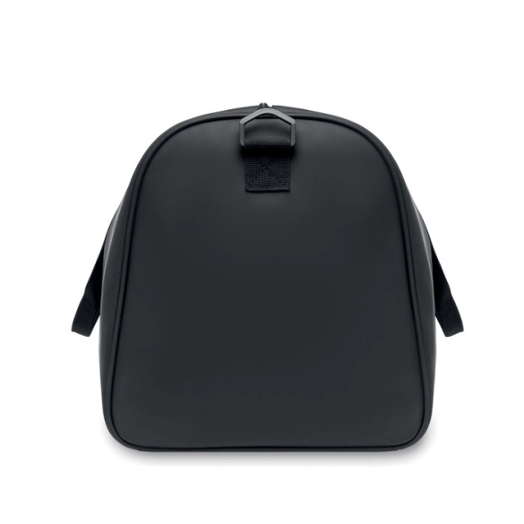 Sac de sport en PU souple avec renfort inférieur en mousse. Un compartiment principal, une poche frontale zippée. doublure en polyester 210D RPET. 2 poignées et une bandoulière réglable et amovible