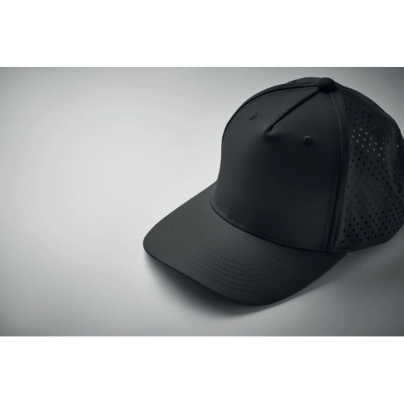Casquette en polyester 5 panneaux avec fermeture auto-agrippante réglable. 4 panneaux perforés. Panneau avant avec 2 œillets cousus de couleur assortie. L'article sèche rapidement et est déperlant. 130 gr/m²