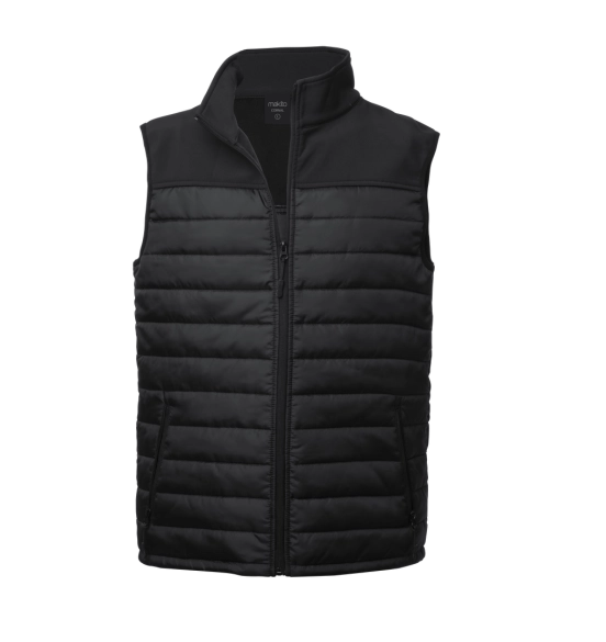 Gilet imperméable et respirant en soft shell et polyester. Couleur noire, fermeture éclair pour les poches, ouverture facile. Disponible dans les tailles S, M, L, XL, XXL.