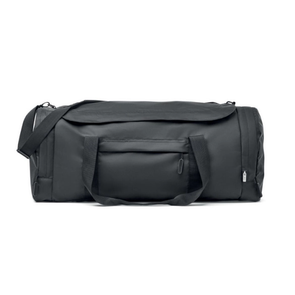 Grand sac de sport ou de voyage en polyester 300D RPET. Compartiment principal avec poches latérales zippées dont une isotherme. Renfort de fond amovible et bandoulière réglable, amovible. Dimensions: 63x29x27cm.