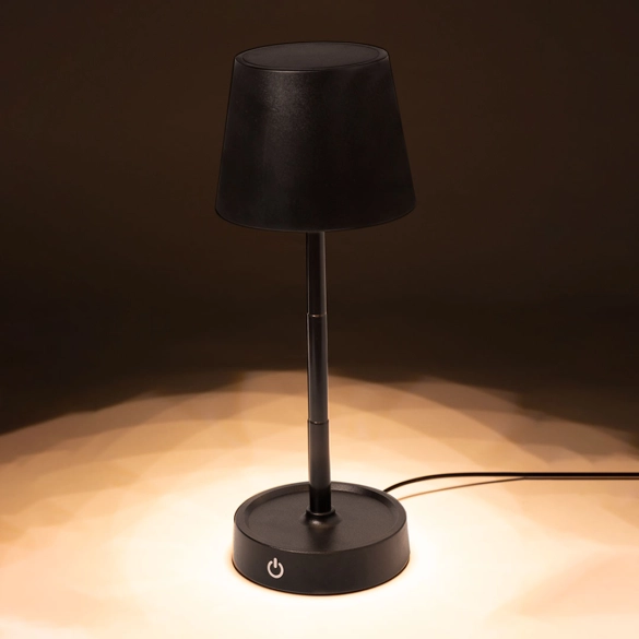 Lampe de design en finition noire mate. Inclut un système de régulation d'intensité lumineuse tactile et un corps pliable pour ajustement en hauteur. Équipée d'une batterie rechargeable de 800mAh par USB Type C -câble inclus- et 12 LEDs de lumière chaude. Avec bouton marche/arrêt à l'arrière.