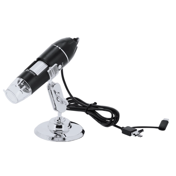 Microscope numérique compact avec un agrandissement de 0-1600X. Lumière LED ajustable et résolution personnalisable jusqu'à 1600x1200 manuellement. Inclut un support ajustable, un câble de 140 cm avec adaptateur USB, Type C et Micro USB, pour une utilisation sur divers appareils. Design élégant en noir mat avec détails argentés, compatible avec l'application pour Android. Dispose d'une règle de calibration et d'un manuel en espagnol et en anglais.