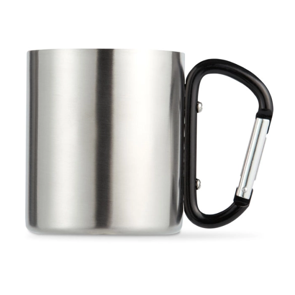 Mug double paroi en acier inoxydable, anse avec mousqueton. Contenance 220 ml.
