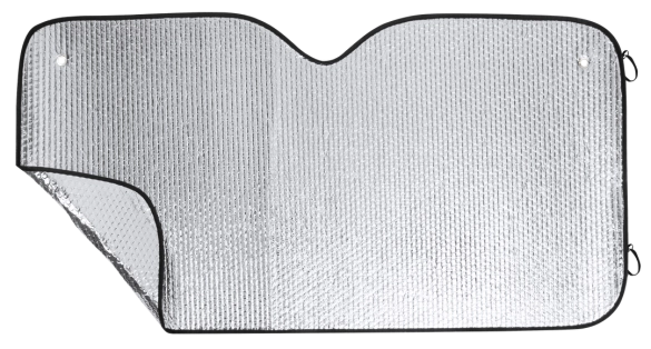 Pare-soleil en aluminium avec bulles sur les deux côtés en coloris argent métallisé et liseré noir. Grande taille de 180 x 90cm, avec anneaux de renfort en métal, sangles élastiques pour le pliage et deux ventouses pour la fixation. Livré à plat pour faciliter l´impression.