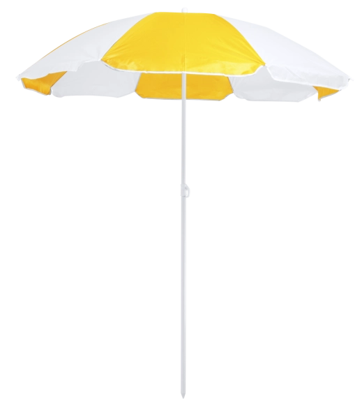 Parasol de plage de 8 panneaux en nylon résistant et bicolore. 150cm de diamètre, avec des jupes latérales et des tubes de couleur blanche recouverts de métal. Réglable en hauteur et présenté dans une housse en PVC avec bandoulière. Disponible dans une large gamme de couleurs.