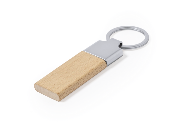 Porte-clés dans une combinaison de matériaux métalliques avec une finition brillante et de bois de hêtre verni. Avec une large surface de marquage et présenté dans un sachet individuel avec une carte kraft.