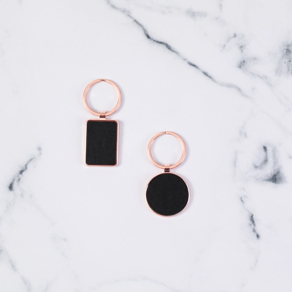 Porte-clés en métal au design sophistiqué, avec revêtement en cuivre galvanisé et finition brillante. Doublure en éco-cuir élégant sur l’une de ses faces et disponible en design rectangulaire et circulaire. Présenté individuellement sac en papier recyclé.