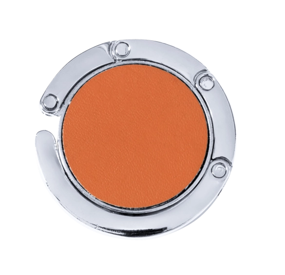 Porte sac pliable en métal avec pastille en similicuir de couleur vive. Présenté en étui individuel avec intérieur mousse.