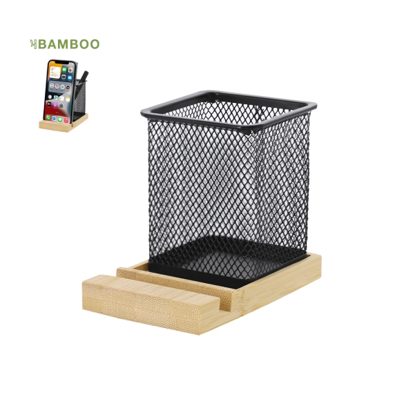 Porte-stylo en maille métallique avec base en bambou naturel. Conçu avec un support pratique intégré pour smartphone.Des matériaux comme le bambou favorisent l'utilisation de matières premières naturelles réduisant les émissions polluantes. De plus, le bambou provient d'une plante très résistante et polyvalente, avec une croissance et une régénération rapides, constituant une excellente alternative à l'utilisation de bois traditionnel.
