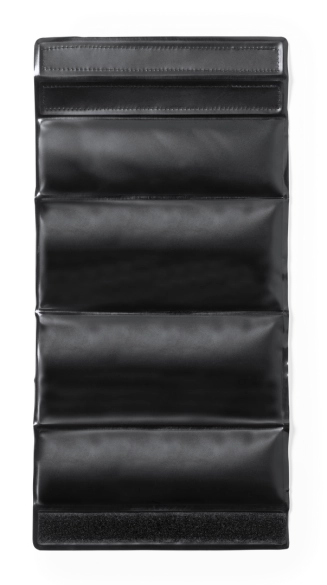 Glacière avec fermeture velcro réglable, liquide réfrigérant intérieur et en PVC noir mat.