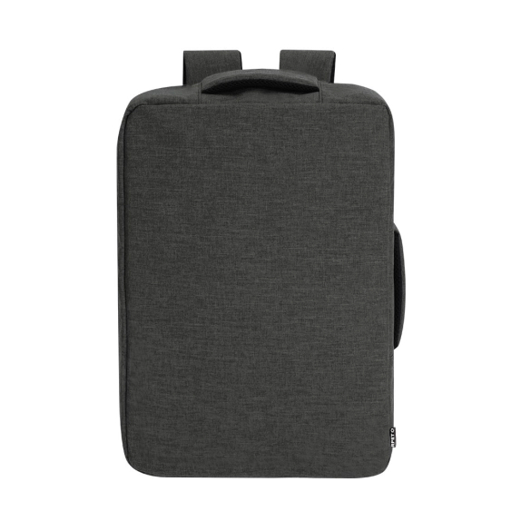 Sac à documents fabriqué en RPET 300D résistant. Présente un design urbain qui incorpore un compartiment principal avec fermeture éclair cachée pour plus de protection, à double tirette. Avec intérieur rembourré pour un ordinateur portable jusqu'à 15 pouces, poches supplémentaires à l'intérieur pour petits objets. Ses bretelles et son dos sont rembourrés et ajustables pour un plus grand confort. Offre trois modes de transport : comme un sac à dos, grâce aux bretelles rembourrées ; comme un porte-documents, grâce à sa poignée de transport ; et sangle pour trolley. Le matériau RPET est élaboré à partir de plastique recyclé, afin de favoriser la réutilisation des déchets plastiques et d'aider à la durabilité de la planète.