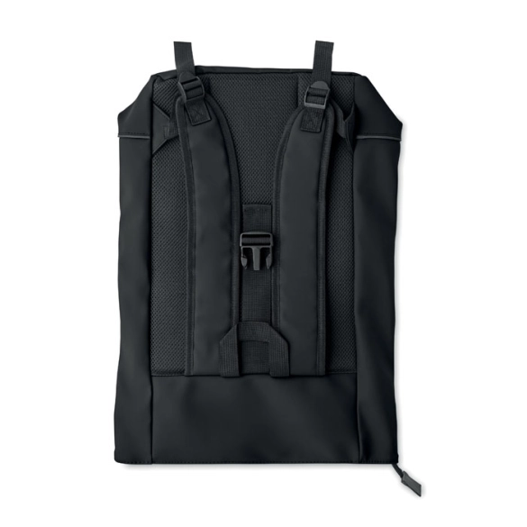 Sac à dos enroulable pour ordinateur portable 15 pouces en PU souple avec dos rembourré, base renforcée et bande réfléchissante. Poche frontale étanche avec fermeture éclair. doublure en polyester 210D RPET.