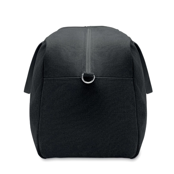 Sac de voyage en tissu recyclé de 450 gr/m² (60% coton recyclé et 40% polyester recyclé) avec sangle en coton réglable et détachable.