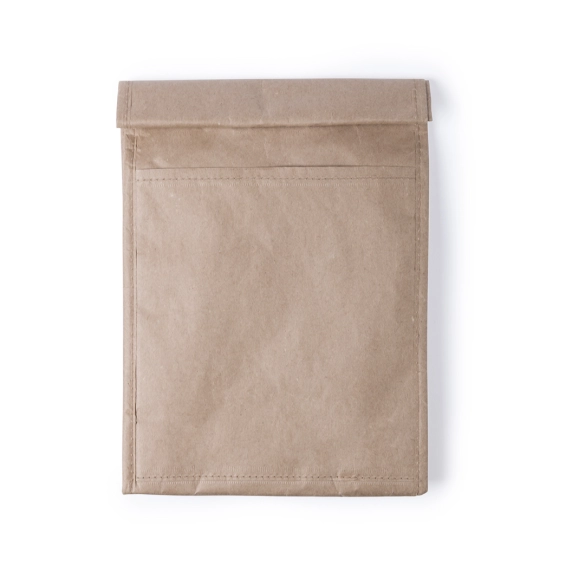 Sac thermique en papier de 85g/m2 résistant à l humidité. Avec intérieur isotherme finition aluminium, poche extérieur et fermeture velcro. Capacité de 2,3 L.