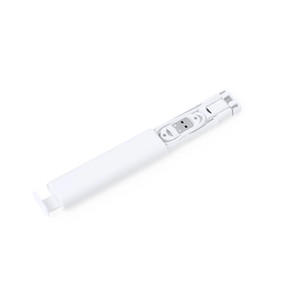 Ensemble complet de câbles chargeurs fabriqués en ABS robuste. Présentés dans un boîtier compact fabriqué en ABS résistant blanc, avec support pour smartphone intégré. Inclut le câble de chargement et de synchronisation, adapté au transfert de données et à plusieurs connexions : Micro USB, Type C et Lightning ; éjecteur SIM inclus. 5V DC 3A. Présenté dans une boîte de conception kraft.