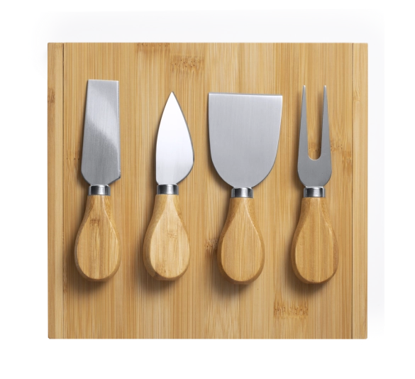 Assortiment original de fromages dans une boîte pliante avec découpe intérieure pour chaque accessoire et dans un format rectangulaire. Accessoires en acier inoxydable avec manche en bambou. Présenté dans une boîte design kraft individuelle.