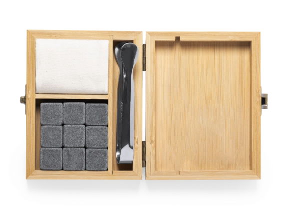 Jeu de 9 glaçons réutilisables. Fabriqué en pierre stéatite naturelle, également appelée pierre ollaire ou pierre à savon, qui maintient la boisson froide sans altérer ses propriétés, étant donné quils ne diluent pas sa teneur en eau, ainsi quils conservent sa saveur originale. Il inclut des pinces en acier inoxydable et une housse en coton. Présenté dans un étui en bambou.