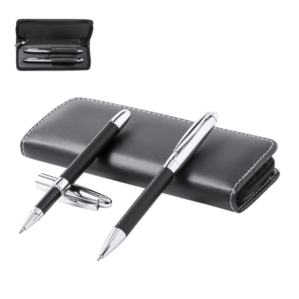 Ensemble premium de stylo et de rouleau. Fabriqué dans une combinaison élégante de similicuir dans des tons noirs et de métal chromé. Stylo à mécanisme rotatif à encre bleue et avec cartouche jumbo. Rouleau avec hotte et encre gel en bleu, charge jumbo. Présenté dans un étui en similicuir individuel avec fermeture à glissière et intérieur assorti avec compartiments individuels.