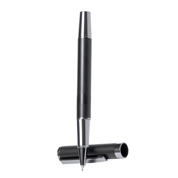 Set de stylo et de roller élégant. Stylo à capuche à mécanisme rotatif et roller, tous deux munis dun clip métallique. À lencre bleue, son corps présente une finition noire mate élégante et des détails chromés subtils. Présentés dans un étui kraft noir, avec un intérieur découpé au toucher de velours.