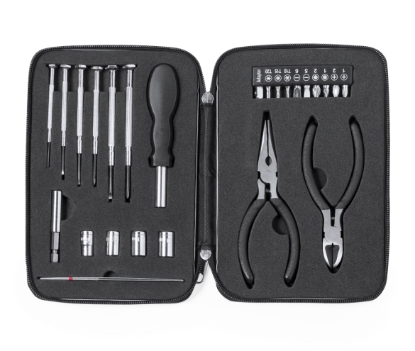 Ensemble d’outils de 25 accessoires dans un boîtier en aluminium résistant avec découpe intérieure en EVA. Comprend un ensemble de tournevis de précision, une poignée multifonction, des embouts interchangeables, des tournevis plats et en étoile têtes de tube et pinces. Présenté dans une boîte individuelle.