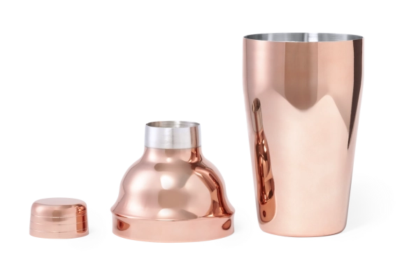 Shaker à cocktail dune capacité de 550 ml en acier inoxydable et revêtement extérieur en cuivre galvanisé. Avec fermeture de sécurité et bouchon doseur sur le dessus. Présenté dans une jolie boîte au design individuel.