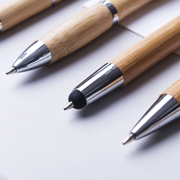 Ellégant stylo stylet à poussoir avec corps en bambou naturel et attributs métalliques coloris argent brillant. Cartouche jumbo. Encre bleue.