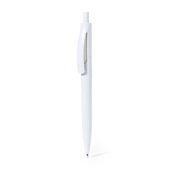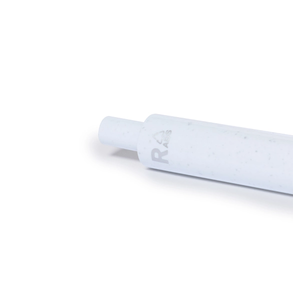 Stylo à bille à bouton-poussoir en ABS recyclé. Avec des accessoires aux couleurs vives et un corps au fini blanc uni doux. ABS recyclé distinctif sur le dessus du stylo. A lencre bleue.