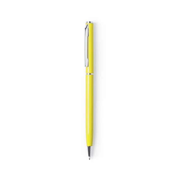 Stylo en aluminium, finition brillant et mécanisme rotatif, avec accessoires et bagues en chrome. Disponible dans une large gamme de couleurs, à l’encre bleue.