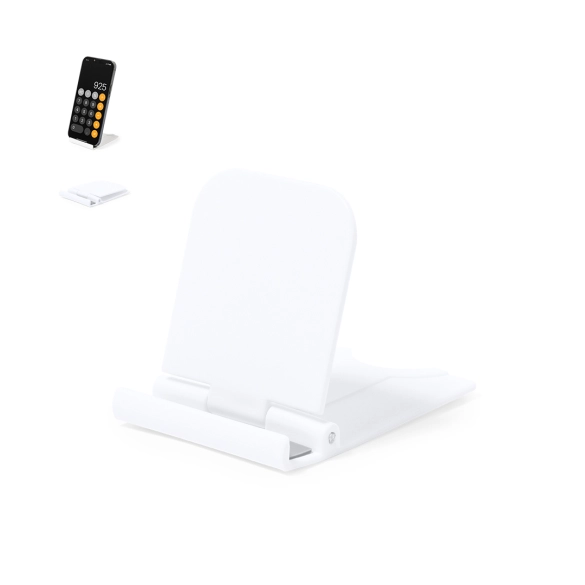 Support pour smartphone et tablette fabriqué en ABS robuste. De conception compacte et pliable pour pouvoir lemporter partout. Avec différentes positions dinclinaison et des coussinets de fixation. Présenté dans un sac individuel recyclé.
