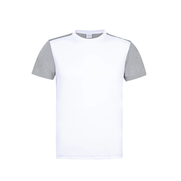 T-shirt technique pour adulte en polyester/élasthanne respirant 135g/m2. Design bicolore, avec le corps en blanc, le dos et les détails en gris. Disponible dans les tailles S, M, L, XL, XXL. Couleur blanche spécialement fabriquée pour limpression par sublimation.