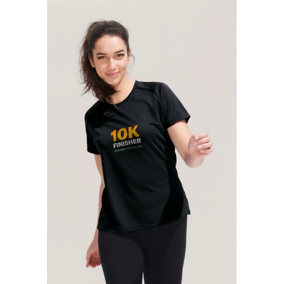 T-shirt de sport manches courtes pour femme Ana en 140g/m². Sa matière respirante, sa coupe avec les manches raglans et ses coutures plates en font le produit idéal pour toutes vos opérations sportives. Matériel:100% polyester effet respirant - Dry fit, Colletage au col, Manches raglan, Dos plus long,