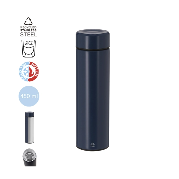 Thermos en Acier Inoxydable Recyclé d'une capacité de 450 ml. Avec double paroi pour une meilleure conservation de la température et intérieur avec revêtement en céramique, adapté aux boissons gazeuses. Infuseur inclus et système d’ouverture facile à vis. Avec distinction d'Acier Inoxydable Recyclé.L'acier est l'un des matériaux les plus demandés et peut être trouvé presque partout, des produits d'usage quotidien aux grandes constructions. Possédant d'innombrables propriétés, notamment sa durabilité et son haut degré de réutilisation, il constitue une alternative très appréciée dans les solutions de durabilité. Correctement traité, il permet d'obtenir de nouvelles ressources d'utilisation infinie.