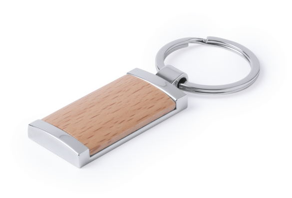 Porte-clés dans une combinaison de matériaux métalliques avec une finition brillante et de bois de hêtre verni. Avec une large surface de marquage et présenté dans un sachet individuel avec une carte kraft.