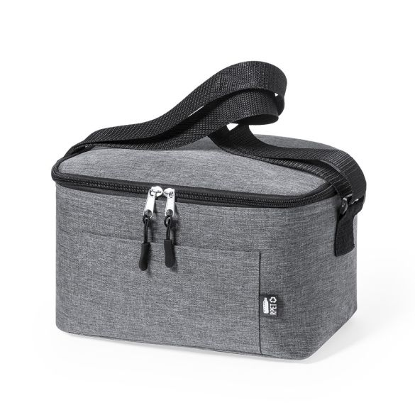 Glacière en RPET 600D résistant. Finition grise, avec base et bandoulière pour le transport en similicuir marron. Comprend 2 compartiments indépendants, avec fermeture éclair et tirette en métal. Interieur isotherme en aluminium et etiquette extérieure RPET. Le matériau RPET est fabriqué à partir de plastique recyclé, afin de favoriser la réutilisation des déchets plastiques et daider à la durabilité de la planète.
