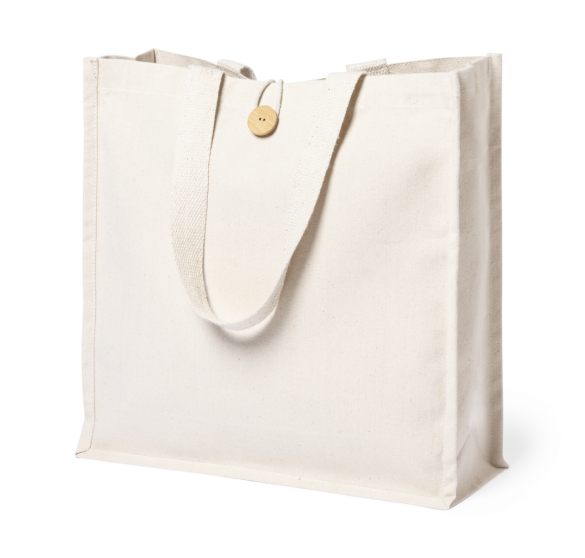 Sac en 100% coton, avec une finition naturelle et un grammage supplémentaire de 310g/m2. Avec fermeture boutonnée dorigine, finitions cousues et à soufflet. Poignées moyennes extra larges et renforcées (60 x 3,5 cm). Résistance jusquà 10 kg de poids.