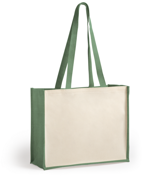 Sac shopping en coton avec une partie en toile de jute et anses courtes. Grammage: 160gr/m².