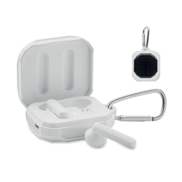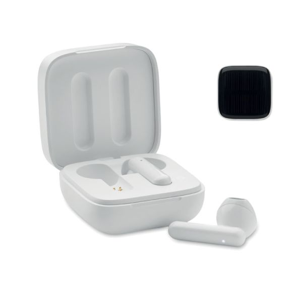 Ecouteurs sans fil ABS True Wireless Stereo (TWS) 5.3 avec microphone et batterie 30 mAh. Durée d'écoute env. 4 h. Batterie à chargement solaire. Appairage automatique. Câble de chargement de type C et chargeur de 200 mAh.